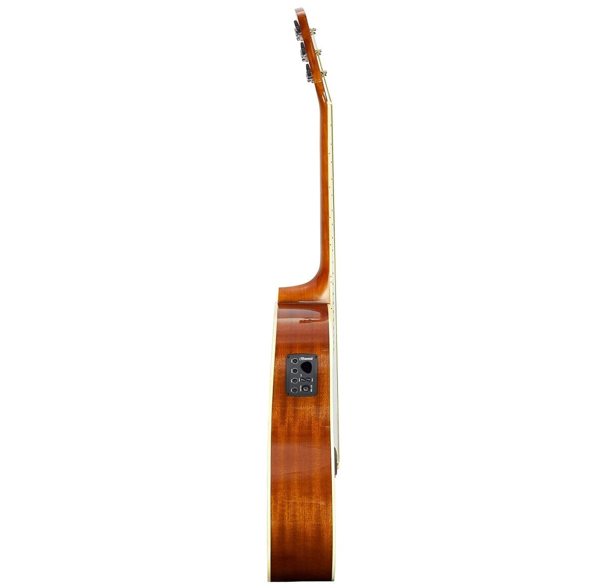 Electro-Acoustic Guitars offer the best of both worlds, as not only do you get a great guitar for unplugged performance, but when you need to play louder, your guitar can be simply plugged into an amplifier. The BD200CE has an integrated pickup under the bridge saddle which is connected to a pre-amp mounted into the side of the guitar. The pre-amp allows you to control the volume and tone of the guitar when amplified. Simply use a 6.35mm (1/4 inch) jack cable to connect from the output socket of your Brunswick Electro-Acoustic guitar to the input on your amplifier, mixer, or computer interface.