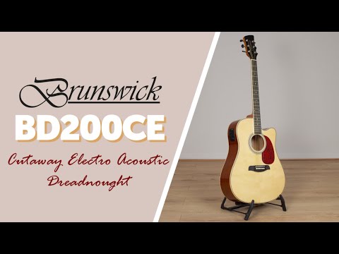 The Brunswick BD200CE model is a Dreadnought Acoustic guitar with a cutaway and pre-fitted electronics. It is built in the traditional dreadnought style with squared shoulders and bottom.