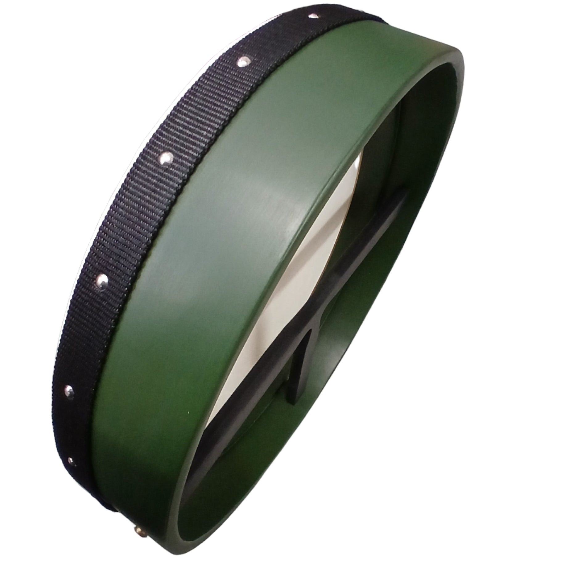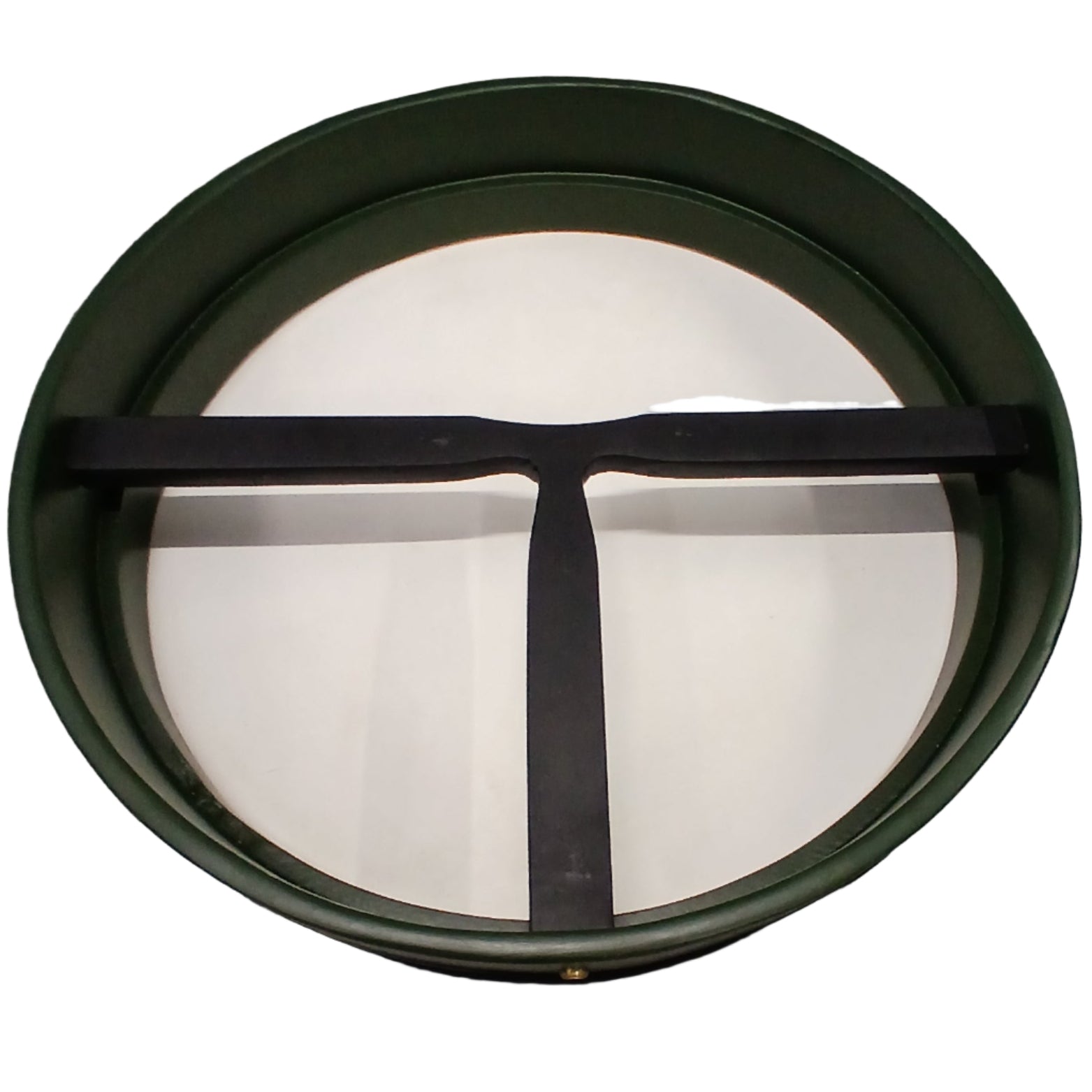 An 16 inch diameter bodhran finished in green and supplied with a tipper and carry bag.