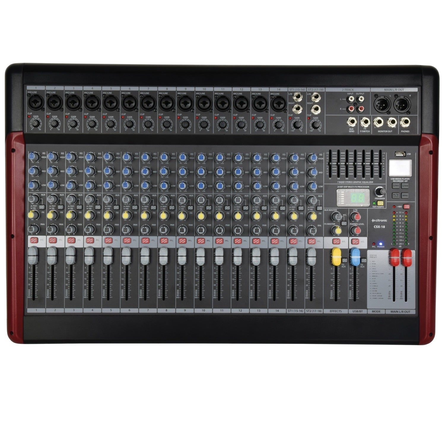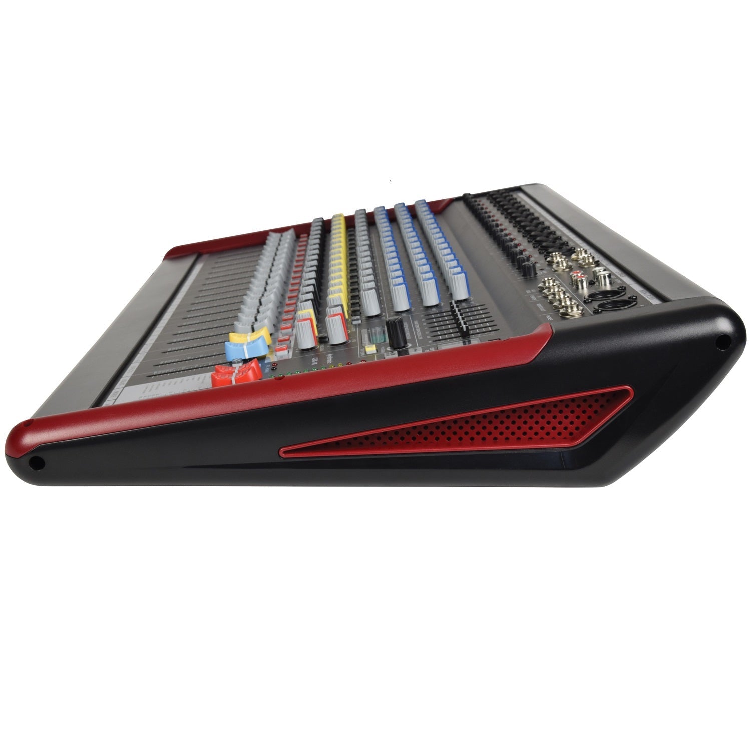 Fully featured live mixing console with 14 mono mic/line inputs on XLR/jack and 2 stereo line jack inputs.