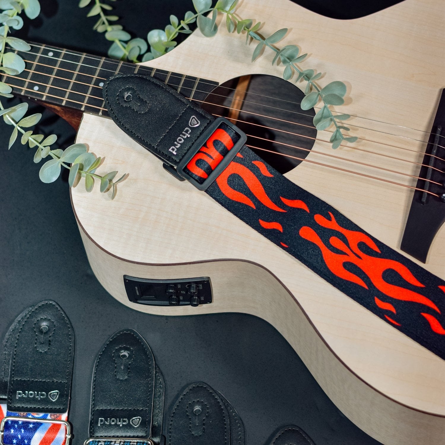 Guitar Strap Red Flames On Black Webbing Rock / Goth