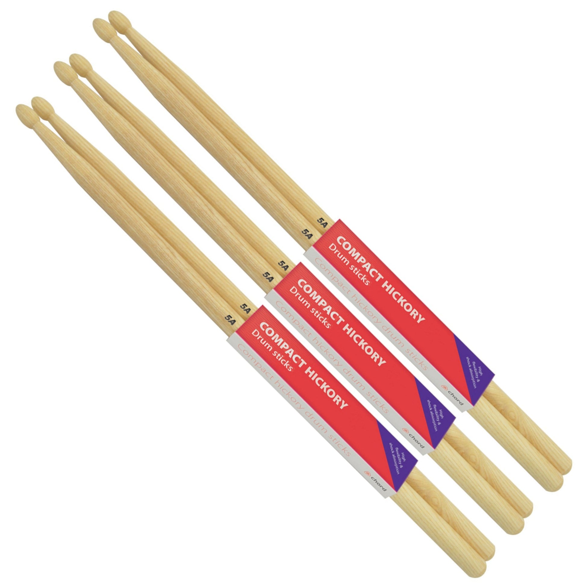 A bundle containing 3 pairs of 5A compact drum sticks made from hickory with WOOD tips.