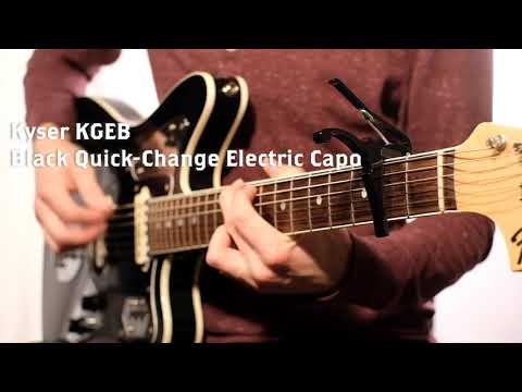 The Kyser Electric Guitar capo contours to the lower action on six-string electric guitar necks, with a slightly smaller body, less radius, and less spring tension than the original Kyser Quick-Change design.