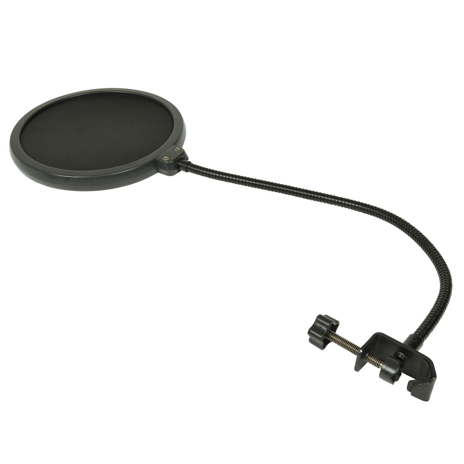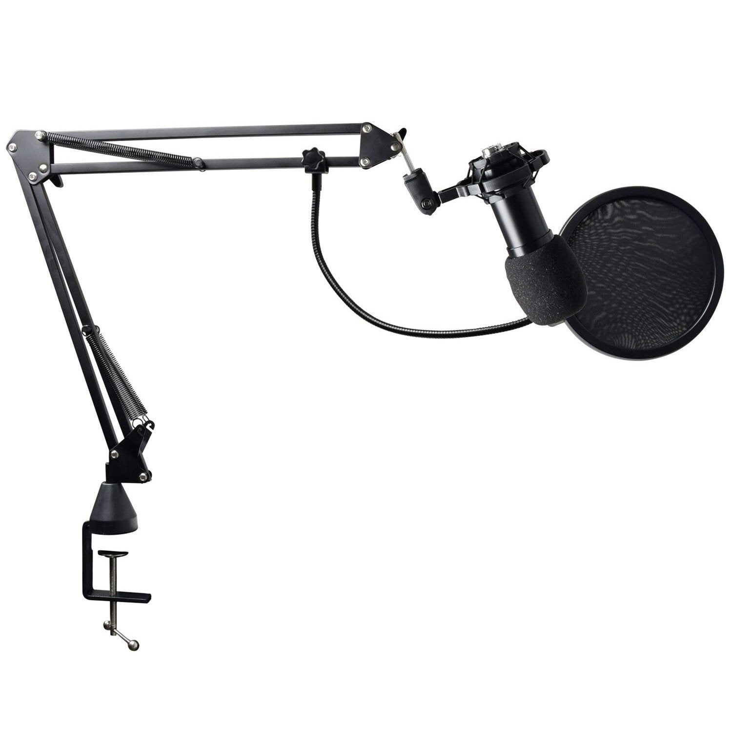 Studio microphone kit comprising a condenser microphone with shock mount, pop filter, pop shield, XLR lead and adjustable arm mount with clamp.