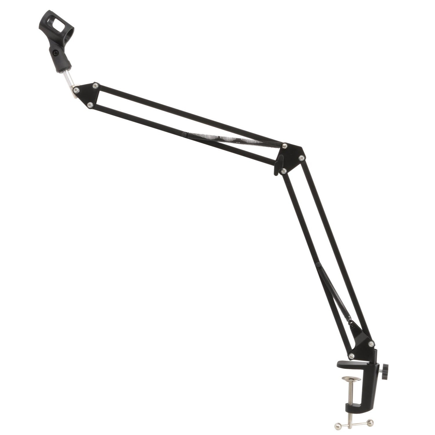A professional microphone boom arm with desk clamp for studio or broadcasting use.