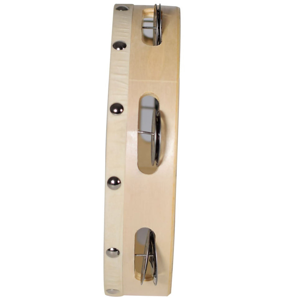 A wooden ring tambourine with a hide head with 12 jingles (6 pairs).