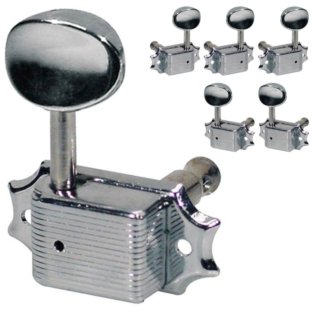 3x left+3x right, vintage style tuners with metal buttons and finished in chrome.