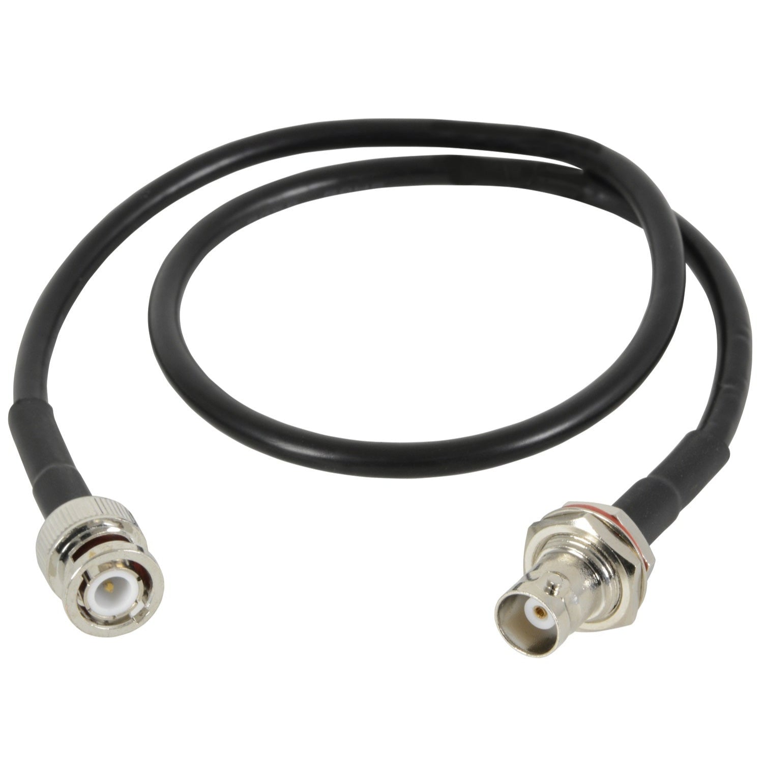 Coaxial extension cable with a male BNC connector at one end and a panel-mountable female BNC connector at the other to enable front mounting of an antenna for rack mounted wireless systems.